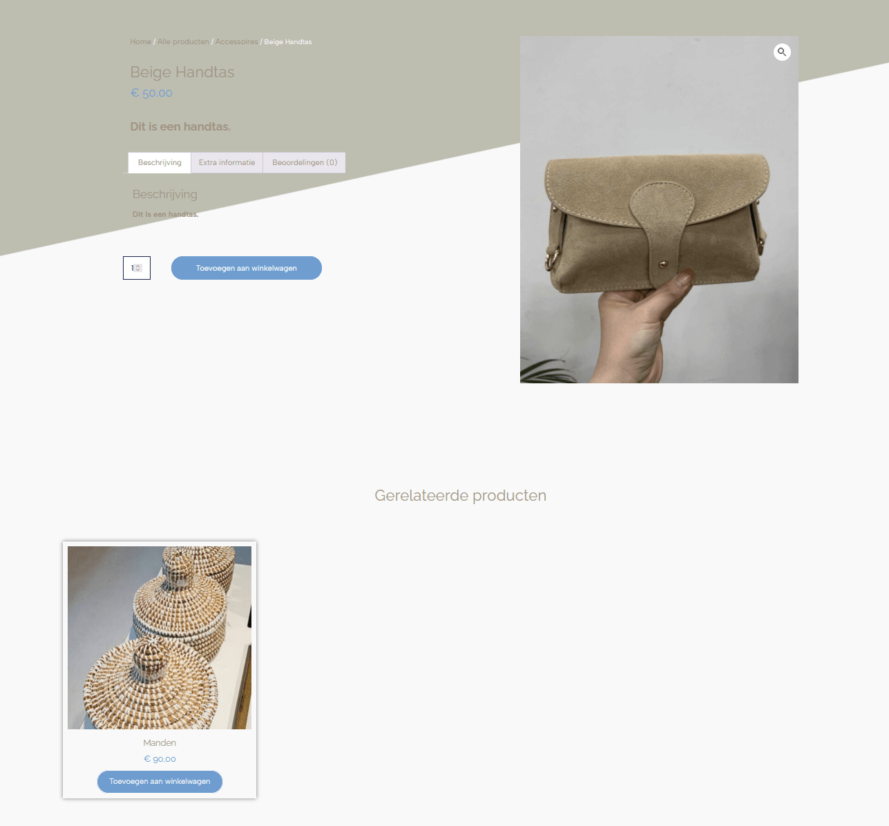 Hier is te zien dat Manden een gerelateerd product van de Beige Handtas is. Met het koppelen van deze producten zorg je ervoor dat er producten aan de klant worden getoond die zij misschien wel interessant vinden en ook willen kopen. Hiermee vergroot je de kans dat de klanten deze producten ook kopen.