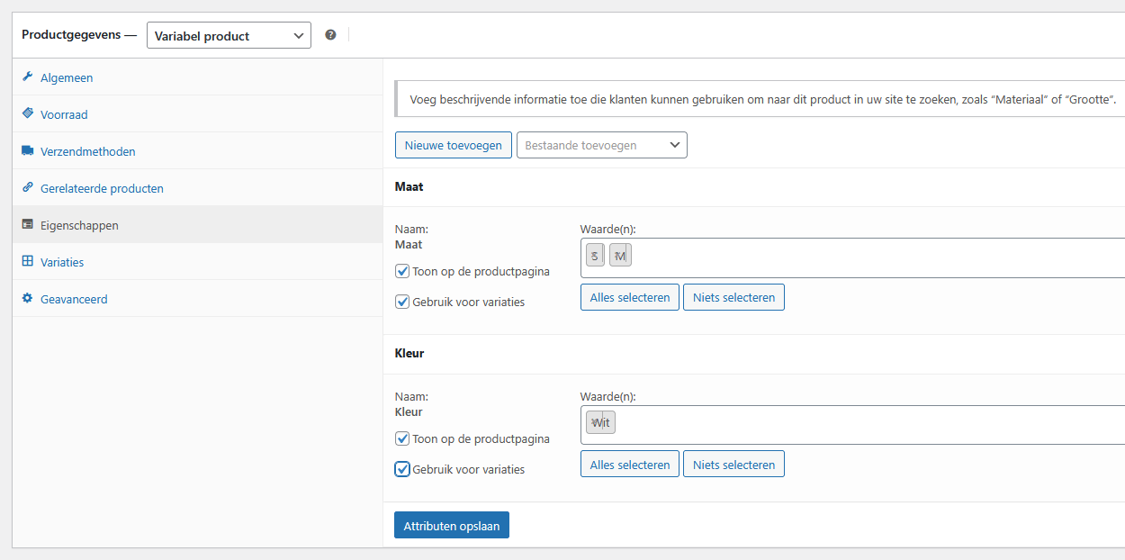 Om de verschillende variaties van de eigenschappen te maken ga je naar het tabje Variaties. Een voorbeeld van een variatie is; Maat M in de Kleur Blauw of Maat M in de kleur Groen.