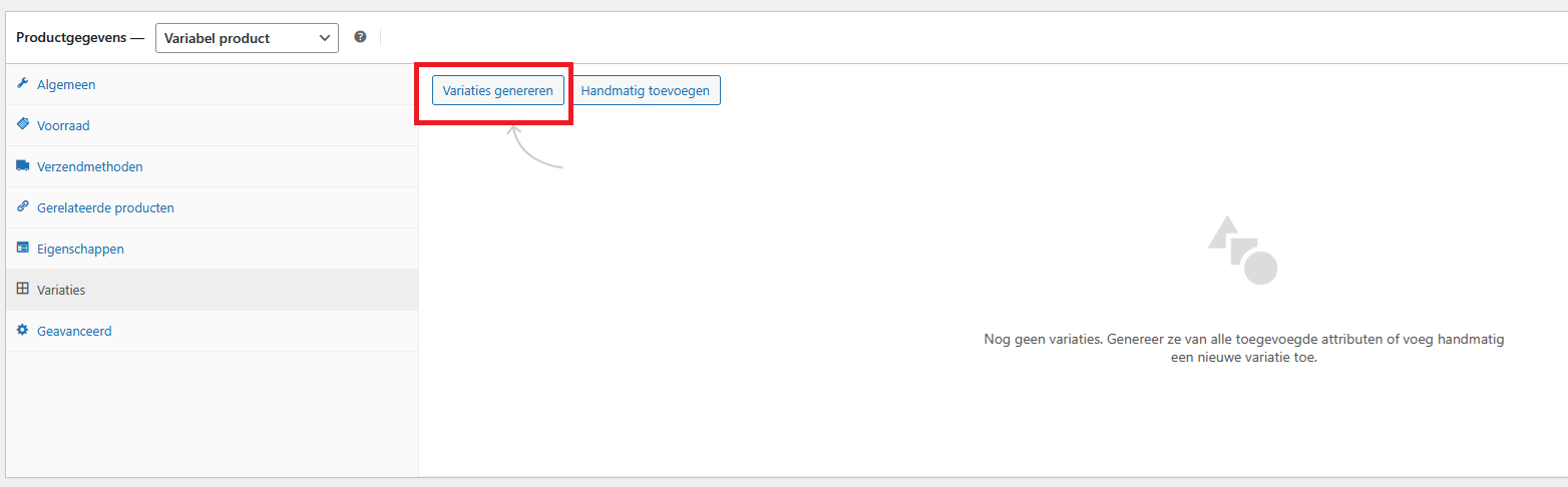 Als je op de knop “Variaties generen” klikt zal de webshop de variaties zelf maken, wil je dit niet dan voeg je deze handmatig zelf toe.