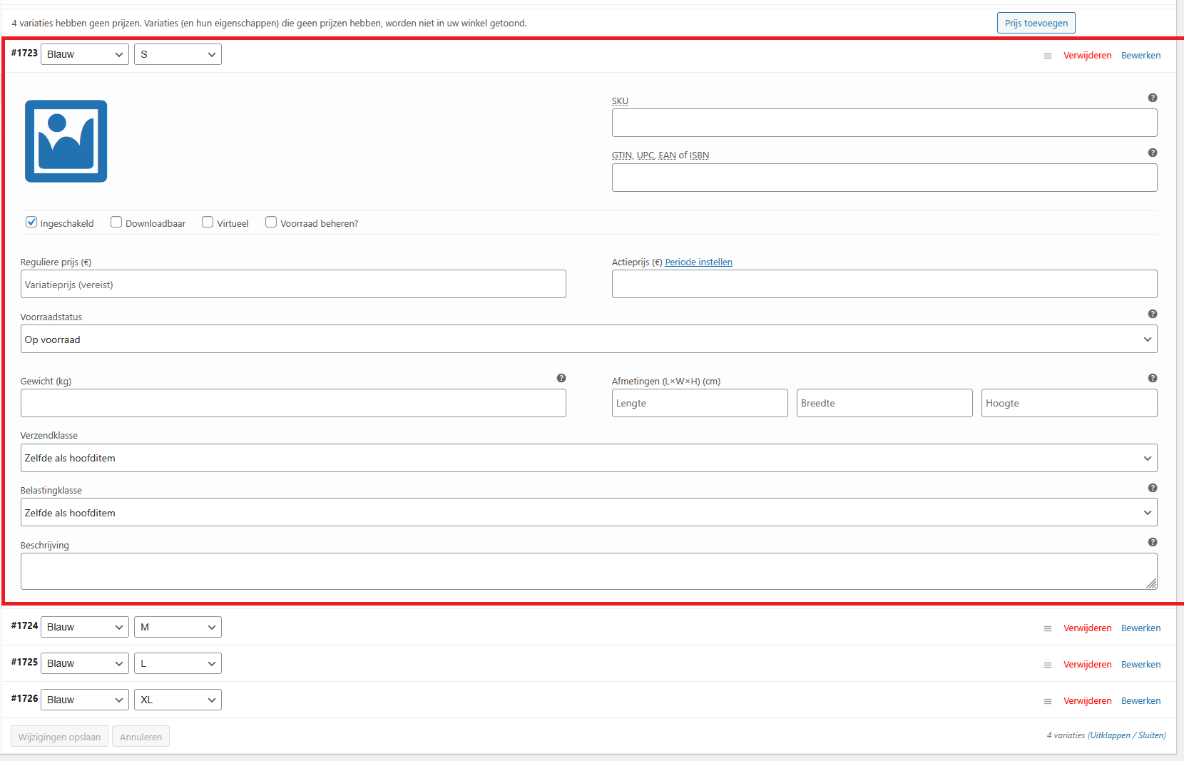 Door op de aangemaakte variaties te klikken kan je nog een prijs toekennen aan elke variatie. Het kan bijvoorbeeld zo zijn dat je een rok verkoopt in een kindermaat voor 29,99 maar dat deze rok in een volwassen maat 39,99 is. Hier kan je per variatie een prijs toekennen. Als je het vakje “Voorraad beheren” aanklikt, kan je per maat aangeven wat de voorraad is. Je kunt zelfs de variatie een eigen SKU-nummer toekennen.