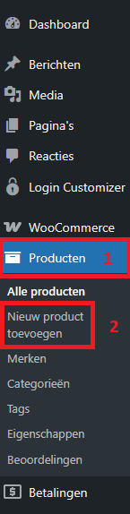 Nadat je bent ingelogd op jouw website zal je terecht komen in het dasboard. Aan de linkerzijde van jouw scherm zie je een menu met daarin alle plug-ins die zijn geïnstalleerd op jouw website of webshop. Zoek naar “Producten”(1) en klik deze aan. Er zal zich nog een sub-menu uitvouwen, klik hier dan weer op “Nieuw product toevoegen”(2). Hieronder is Producten menu uitgevouwd te zien.