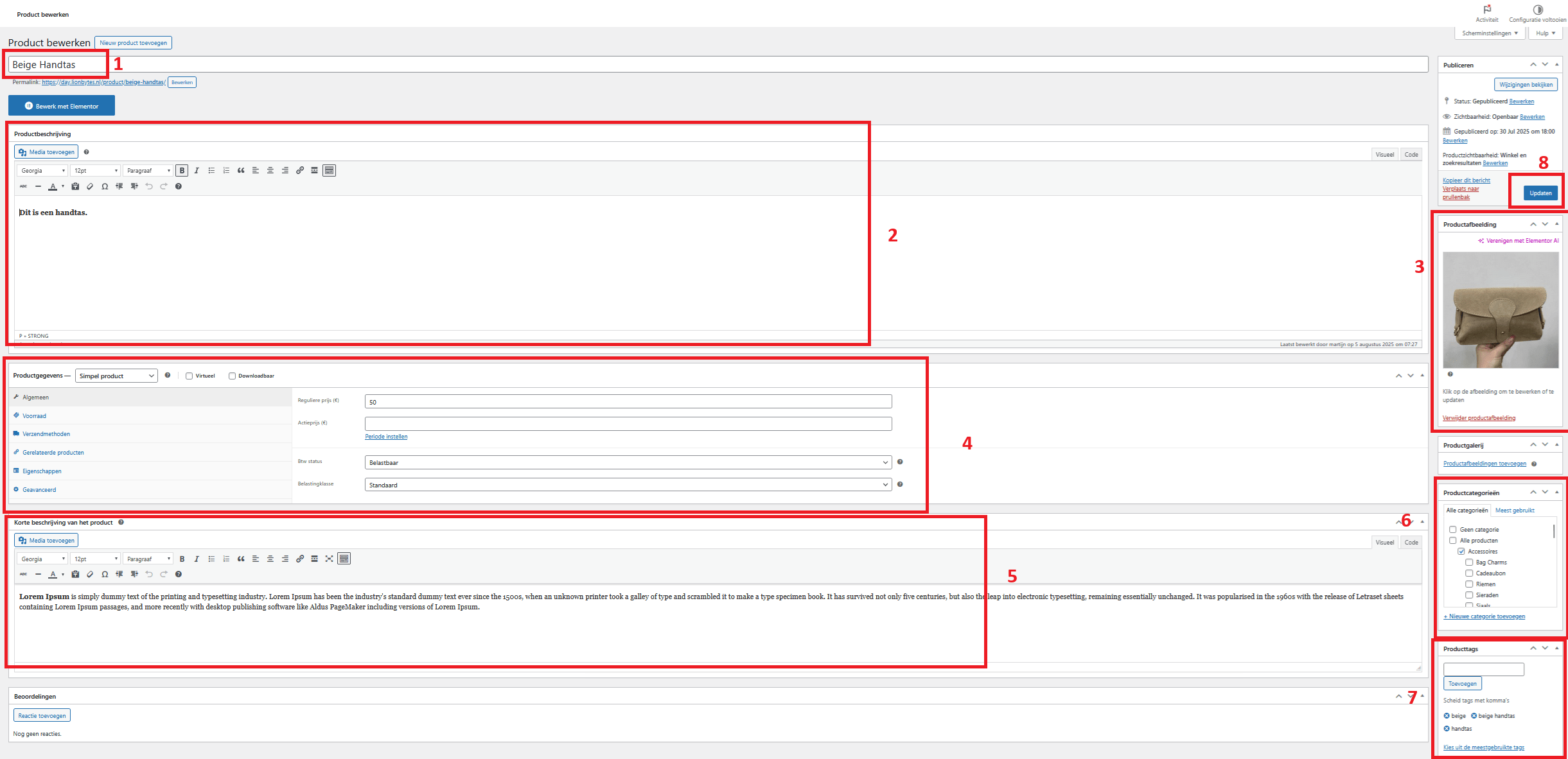 Vul hier een productomschrijving in van het product. Ik heb hier als omschrijving gebruikt “Dit is een beige handtas”.