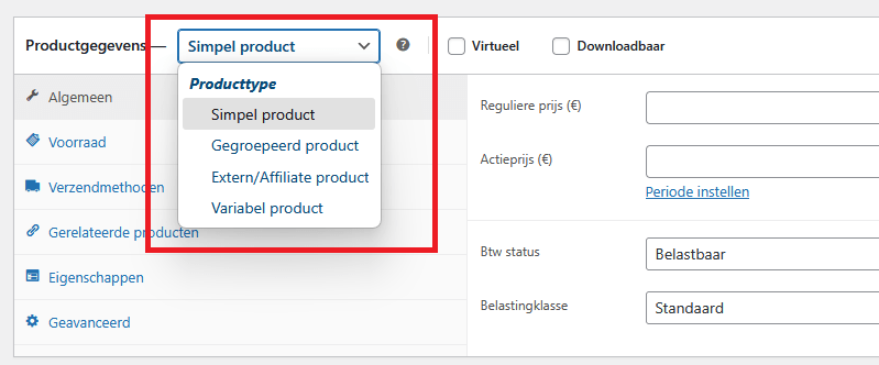 Variabel product – Deze kies je wanneer je meerdere variaties (bijvoorbeeld kleuren of maten) hebt van hetzelfde product. Bijvoorbeeld in kleding zal je (bijna) altijd kiezen voor een Variabel product.