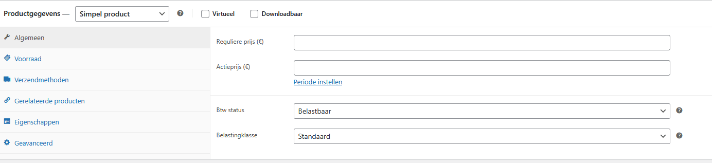 In het tabje Algemeen voer je de prijs in. Je laat BTW Status en Belastingklasse zo staan. Eventueel kan je een actieprijs instellen voor een bepaalde periode.