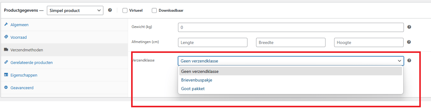 Hier is het belangrijk om de Verzendklasse aan te geven. Voor brievenbuspakketjes geld een ander verzendtarief dan voor een normaal of groot pakket. Het gewicht en de afmetingen is mogelijk maar niet per definitie nodig.